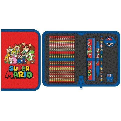 Super Mario penál naplněný Tento produkt je tematicky zaměřený na populární postavy z herní série Super Mario, což je patrné z výrazného barevného designu na přední straně penálu. Obal je červený s modrým lemováním a zdobí ho skupina hlavních postav, jako jsou Mario, Luigi, Princezna Peach, Donkey Kong, Yoshi a další. Nápis „Super Mario“ je výrazný a barevný, což zdůrazňuje herní téma produktu. Penál má tvar obdélníku, který je praktický pro uložení školních potřeb a snadno se zipem otevírá a zavírá. Uvnitř penálu je pečlivě uspořádaná sada školních potřeb, které jsou rovněž zdobeny motivy Super Maria. Najdete zde deset tužek s potiskem různých postav, což poskytuje dostatek zásob pro psaní či kreslení. Dále je zde pravítko, pero, zvýrazňovač, guma a ořezávátko – všechny tyto předměty nesou jednotný grafický design s postavami ze světa Super Mario. Interiér penálu je černý s jemnými vzory motivů z hry, což dodává celkovému vzhledu jednotnost a zvýrazňuje herní téma. Penál je tedy nejen esteticky atraktivní pro děti i fanoušky této herní série, ale také prakticky vybavený pro školní nebo kreativní potřeby. Díky kompletnímu naplnění a kvalitnímu zpracování je vhodný jako dárek nebo doplněk školních pomůcek. Celkově produkt spojuje funkčnost s oblíbenou licencí, což jej činí zajímavým a originálním školním doplňkem.