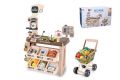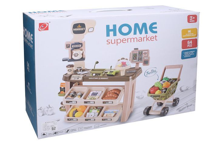 Supermarket s efekty. Rozměry 63x35x84 cm. Světelné a zvukové efekty. 2xAA do platebního terminálu, 2xAAA do čtečky čárových kódů nejsou součástí. Přepínač ON/OFF na spodní straně platebního terminálu. Součástí supermarket, pokladna, čtečka čárových kódů, platební terminál, platební karta, bankovky, mince, vozík, ovoce, zelenina, mléko, káva, džus, cookies, pizza, oříšky a další potraviny. Obrázkový návod na sestavení na spodní straně obalu.