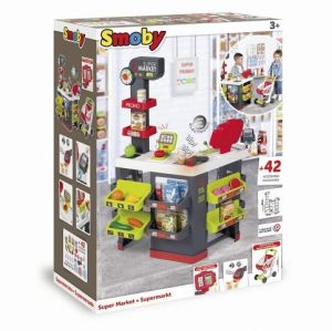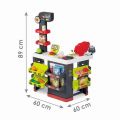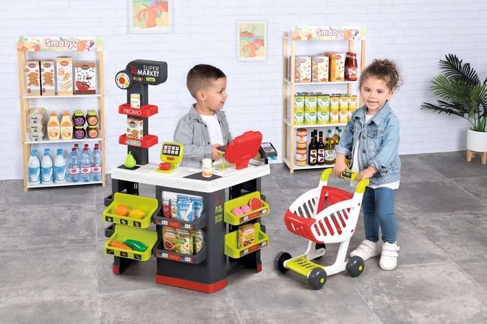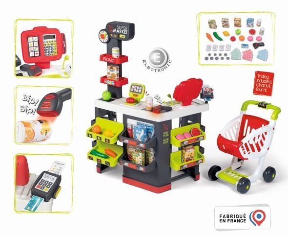 Praktický nákupní vozík má v rukojeti přihrádku na mince, stejně jako skutečný. S elektronickou pokladnou s LCD displejem, funkcí výpočtu a skenerem s funkcí zvukového a světelného signálu, mikrofon (bez funkce), bankovky a mince, které lze uložit do výklopné přihrádky na peníze. Kreditní kartu lze vložit do čtečky karet. Ovoce a zeleninu lze vážit na mechanických vahách a součástí jsou také sladkosti a spousta maket obalů na potraviny. Zboží lze přehledně vystavit v regálech. Nastavitelné hodiny. Celkem 42 doplňků. Rozměry produktu (DxŠxV): 60 x 60 x 89,6 cm.