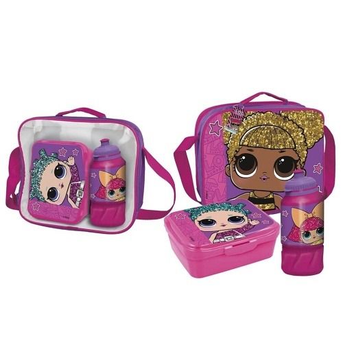 Svačinová taška L.O.L. – obsahuje plastový box na svačinu, plastovou láhev na pití a tašku přes rameno. Materiál 80% polyester a 20% PVC.