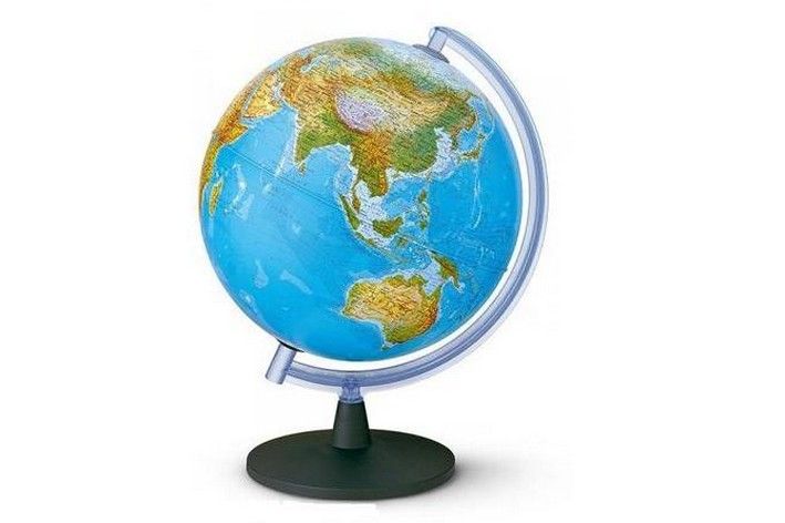 Zhasnutý globus - zeměpisné zobrazení: na mapě jsou zvýrazněny hory, údolí, nížniny, roviny, mořské příkopy. Stínovaný reliéf hor navozuje pocit trojrozměrnosti a dodává globu hloubku.