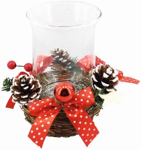 Svícen se skleněnou nádobou s červenou puntíkovanou mašlí 25 cm