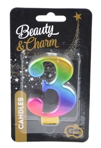 Svíčka dortová - číslice 3, metalická, duhová 8cm