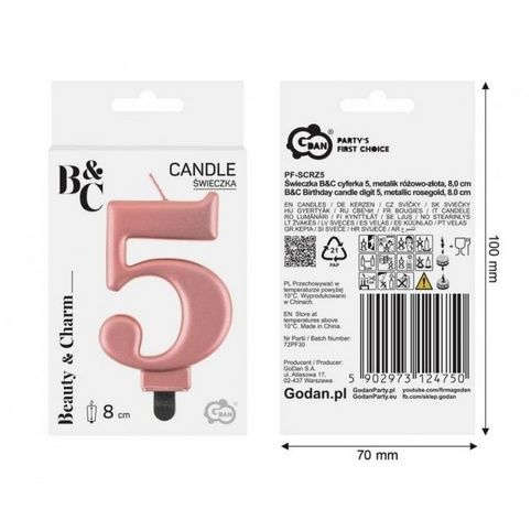 Svíčka dortová - číslice 5, metalická, růžová 8cm