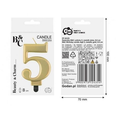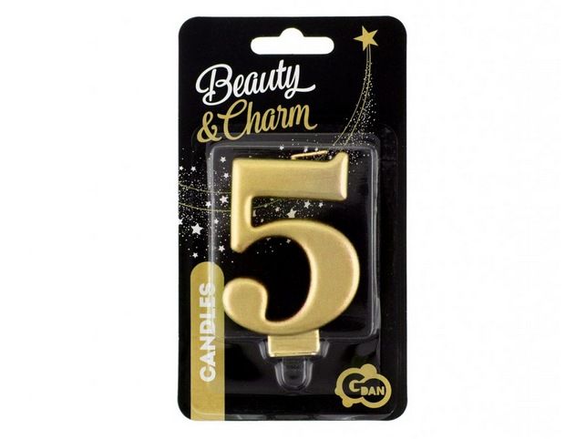 Svíčka dortová - číslice 5, metalická, zlatá 8cm