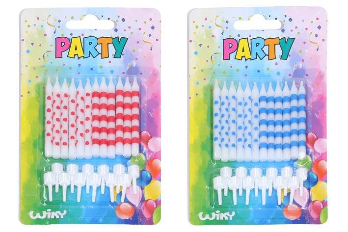 Balení 12 ks svíček s puntíky a proužky + stojánků