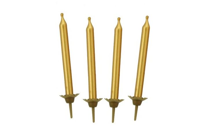 Dortové svíčky zlaté. V balení naleznete 10 kusů. Svíčky jsou nezbytným doplňkem narozeninového dortu. V balení naleznete i držáčky na svíčky, které lze jednoduše zapíchnout do dortu a nepoškodit ho tak svíčkami.