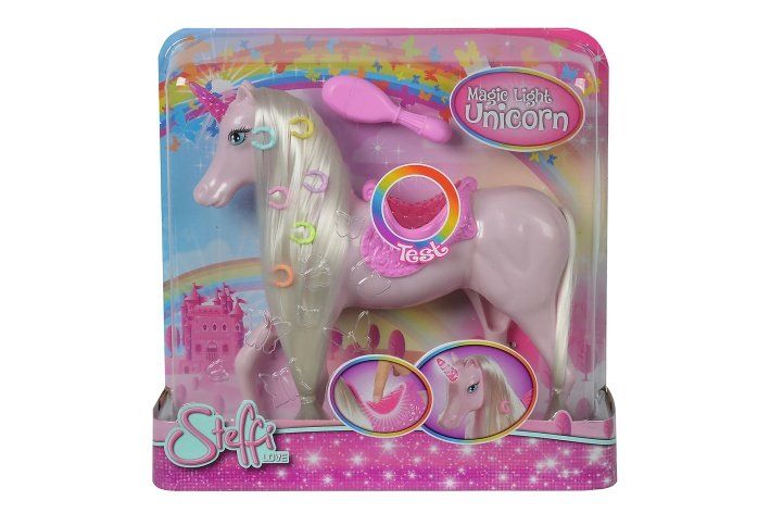 Jednorožec se svítícím rohem a sedlem, součástí ozdoby a hřeben na hřívu, pro panenky o velikosti 29 cm. Panenka není součástí.