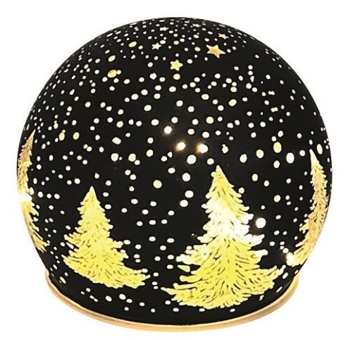 Svítící skleněná koule s motivem lesa – černá, o 10 cm, teplá bílá, 10 LED, časovač