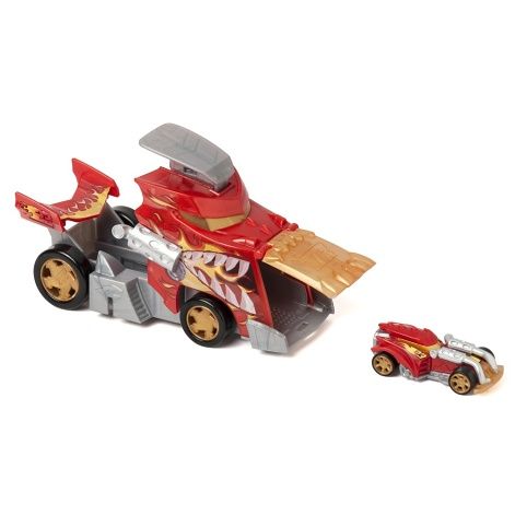 Produkt T-Racers S autíčko Launcher Fire Dragon představuje dynamický závodní set skládající se z většího vysílacího kamionu a menšího závodního vozítka s názvem Dragon Instinct. Kamion má výrazný design inspirovaný dračím motivem, převážně v červené barvě s detaily v zlaté a stříbrné, které podtrhují jeho ohnivý charakter. Karoserie kamionu je zdobena plameny a dračími zuby, díky čemuž působí agresivně a připraveně k závodu. V přední části kamionu je otevírací plocha, do které lze naložit menší autíčko. Funkčnost tohoto setu je založena na jednoduchém, ale zábavném mechanismu vystřelování. Menší vozítko Dragon Instinct se vloží do kamionu, který funguje jako launcher, a po stisku či zatlačení se autíčko vystřelí s velkou rychlostí ven. Tento prvek podporuje hraní závodů a soutěžení mezi více kamionovými sety, například ve spojení s Ice Launcher Truck, jak je uvedeno na obalu. Autíčko Dragon Instinct má podobný design jako kamion, laděný do červeno-zlatých odstínů s detaily plamenů, což vytváří jednotný styl celé sady. Celý set je vyroben z pevného plastu s matným i lesklým povrchem, který zajišťuje odolnost během hry. Kola obou vozidel jsou zlaté a dobře se otáčí, což přispívá k plynulému pohybu. Balení je barevné a přehledně zobrazuje hlavní funkce produktu, včetně jednoduchého návodu k použití: naložení autíčka, stisknutí kamionu pro vystřelení a možnost propojení s jinými sadami pro závodní režim. T-Racers Launcher Fire Dragon je tak vhodný zejména pro děti, které mají rády akční hračky s možností interaktivní hry a závodění.