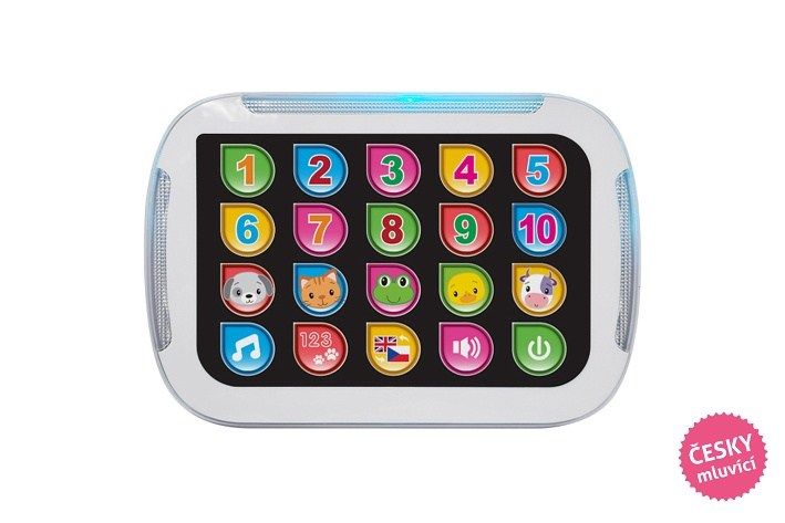 Tablet dětský - mluví česky. Rozměry 19x13 cm. Světelné a zvukové efekty. 3xAAA baterie součástí. Aktivace tlačítkem v pravém dolním rohu. Výuka čísel, zvířat, melodie, změna jazyka, nastavení hlasitosti.