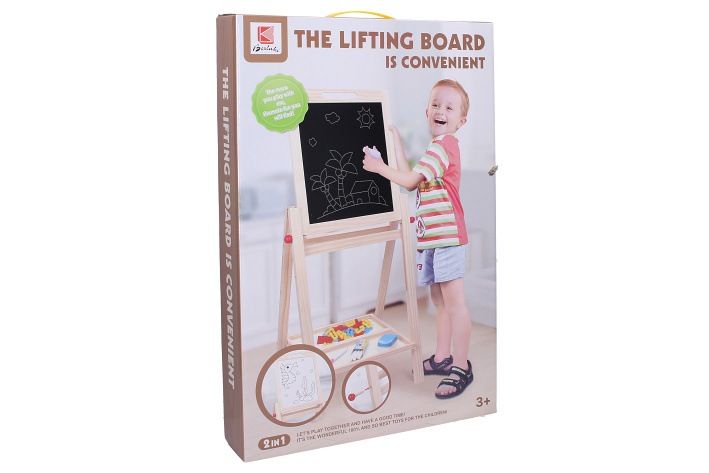 Piš, maluj, uč se - zkrátka dělej, co tě napadne. Můžeš si s kamarády zahrát na školu a postavit se do role učitele. Co všechno už umíš? Oboustranná dřevěná tabule. Na černou tabuli mohou děti malovat klasickými křídami, stejně jako ve škole. Na druhou bílou stranu, pak barevnými fixy, které jde jednoduše setřít hadříkem.