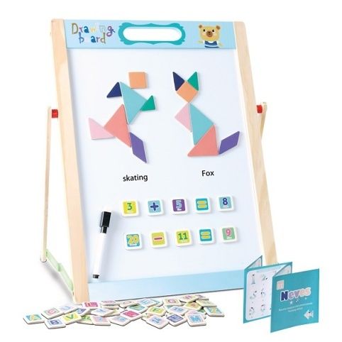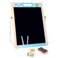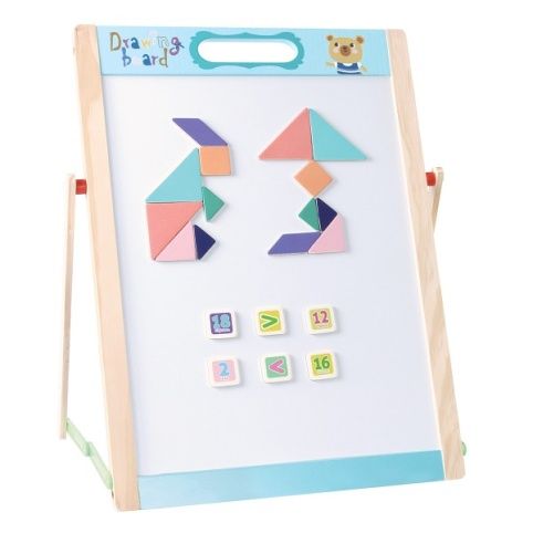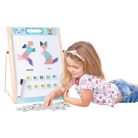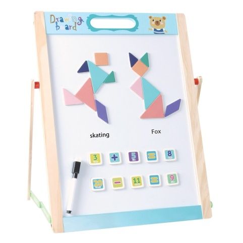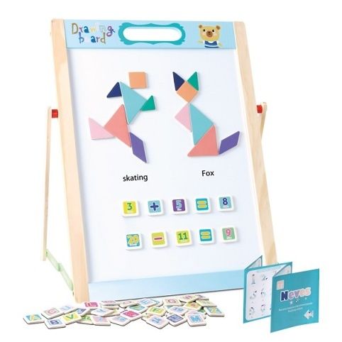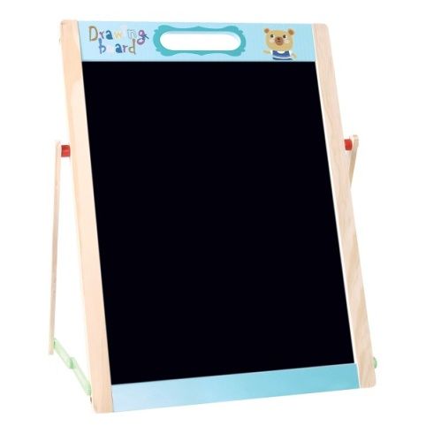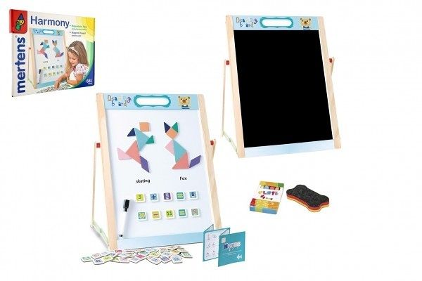 Skládací oboustranná dětská tabule se spoustou příslušenství. Jedna strana je bílá a magnetická pro připevnění přiložených magnetických obrázků nebo pro psaní fixou; druhá strana je břidlicová pro psaní křídou. Součástí je křída, fix a guma. Hrací tabule
