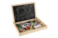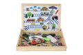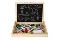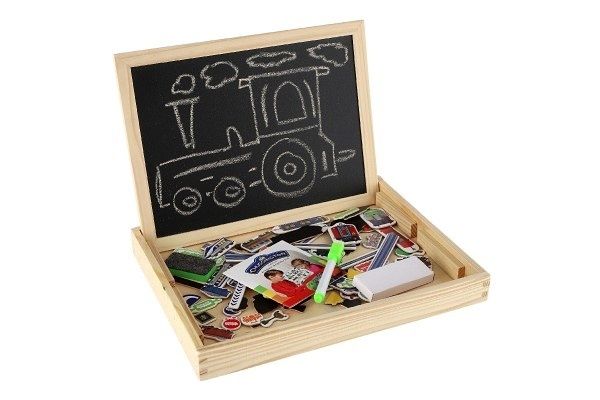 Magnetická tabule s křídou na téma vlaky. Sada se skládá z dřevěné krabičky, jejíž víko slouží jako tabule, také v krabičce jsou barevné křídy, fiau, guma a až 100 magnetů. Můžeme je připevnit na tabuli a kreslit další prvky, dle fantazie Vašich nejmenších. Na druhou stranu na tradiční tabuli můžeme vytvářet obrázky pomocí klasické křídy. Díky tomu, že máme k dispozici dřevěnou krabičku, vejdeme do ní veškeré dostupné příslušenstv a přenášení sady je mnohem snazší. Sada trénuje kreativitu a umělecké dovednosti.
