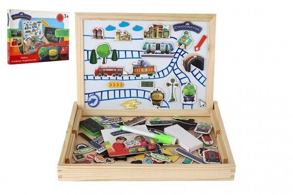 Tabule oboustranná magnetická dřevo černá/bílá Chuggington/Veselé vláčky s doplňky v krab.