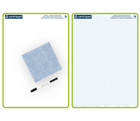 Oboustranně stíratelná tabulka s potiskem pomocného rastru. Speciální povrch s předtištěnými čtverečky je ideální pomůckou pro nácvik správného psaní a kreslení. Vhodná i do kanceláře. Sada obsahuje stírací textilii a značkovač s ergonomickým držením. Značkovač je plněný zdravotně nezávadným, za sucha stíratelným inkoustem. Skladujte ve vodorovné poloze, ventilační chránítko, po použití uzavřít. Rozměr: 34 x 48 cm