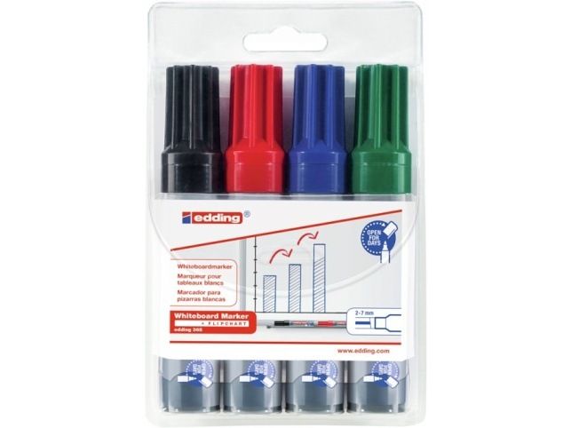 Popisovač EDDING 365 pro široké psaní a značení na whiteboard nebo flipchart. Je vhodný pro psaní na hladké skleněné, melaminové nebo emailové povrchy a papír. Extra široký zkoseným hrot – šíře stopy 2-7 mm. Lze odstranit suchou cestou prakticky ze všech neporézních povrchů. Inkoust je rychleschnoucí, odolný vůči světlu, bez přidaného butylacetátu, s nízkým zápachem. Technologie „cap-off“ - popisovač můžete nechat bez víčka i několik dní, aniž by vyschl (testováno podle normy ISO 554). Fix je možné znovu naplnit pomocí EDDING BT 30. K dispozici jsou i náhradní hroty (EDDING 365). Popisovač skladujte ideálně ve vodorovné poloze.