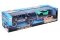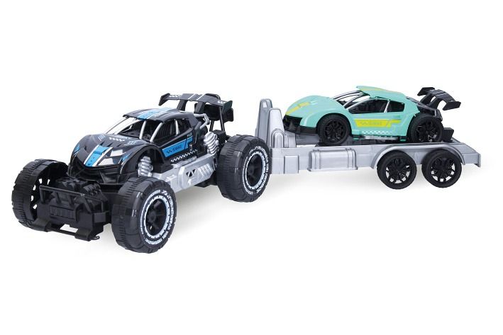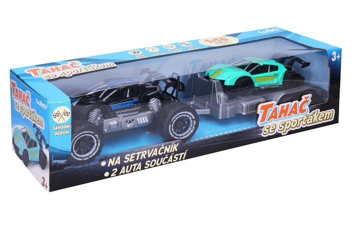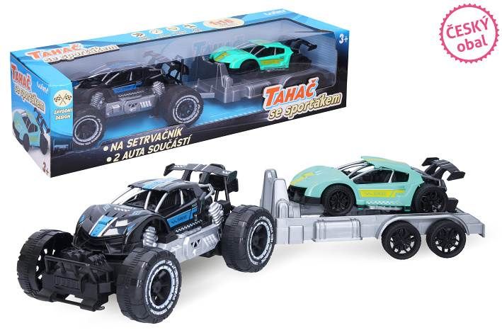 Tahač s autem. Rozměry 45x12,5x9,5 cm. Obě auta na setrvačník. Jen barevná varianta - větší auto černé, menší zelené.