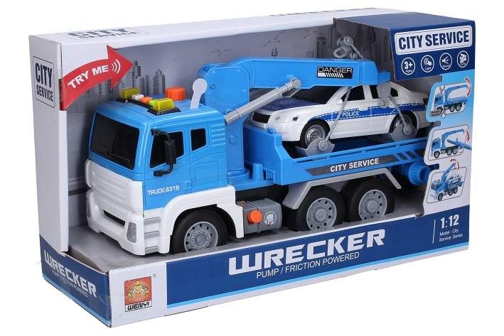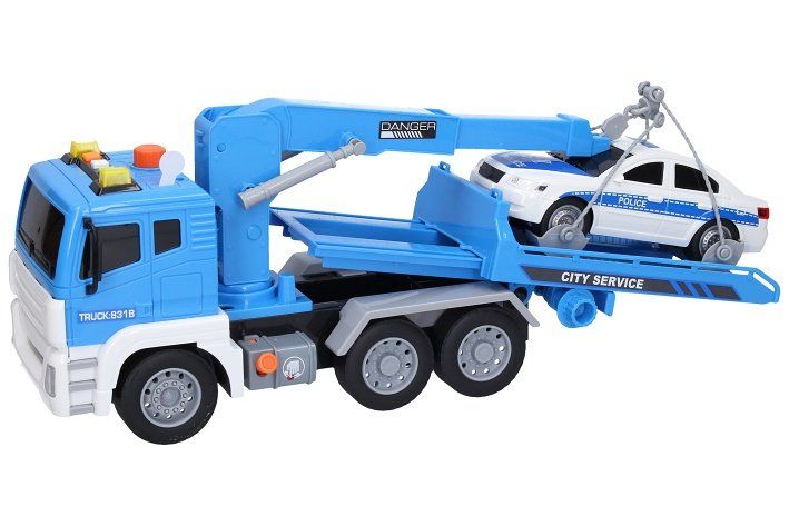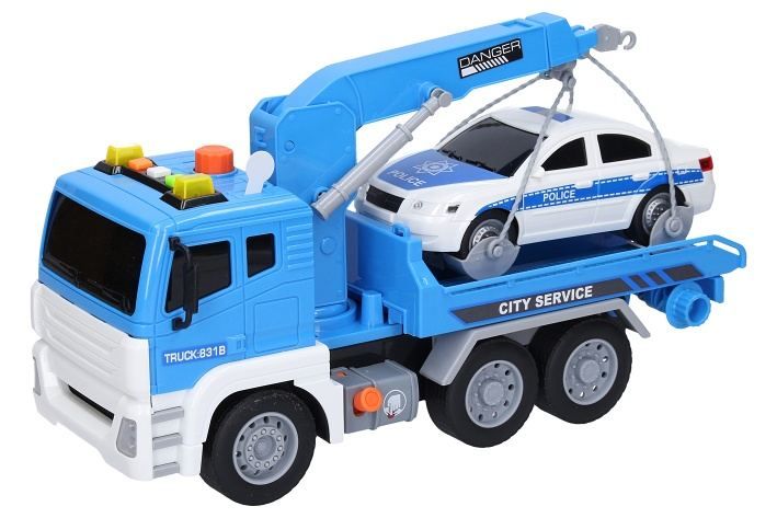 Tahač s autem a efekty. Rozměry 30x13x17 cm. Na setrvačník. Světelné a zvukové efekty tlačítky na kabině tahače. 3xAG13 baterie součástí. Velké oranžové tlačítko na kabině - hydraulika nakládacího ramene - zvedání. Oranžová páčka mezi koly položení (uvolnění) nakládacího ramene.