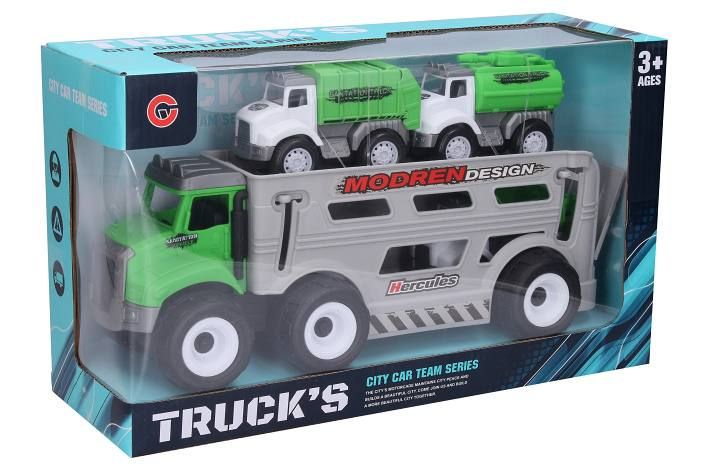 Tahač s auty. Velikost tahače 31 cm. Obsahuje: tahač s volnými koly, 3 autíčka na setrvačník.