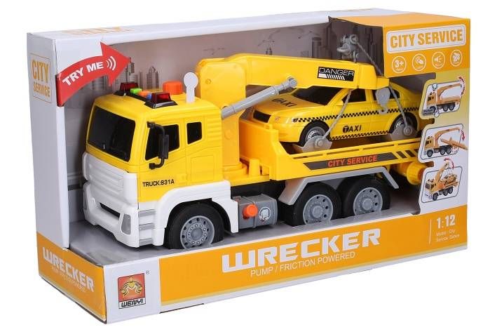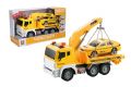 Tahač s taxíkem a efekty. Rozměry 30x13x17 cm. Na setrvačník. Světelné a zvukové efekty tlačítky na kabině tahače. 3xAG13 (1. 5V) baterie součástí. Velké oranžové tlačítko na kabině - hydraulika nakládacího ramene - zvedání. Oranžová páčka mezi koly položení (uvolnění) nakládacího ramene.