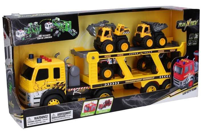Tahač se 4 auty a efekty. Velikost tahače 45 cm, malých aut 8-10 cm. Na setrvačník. Světelné a zvukové (couvání, troubení, zvuk plošiny, motor) efekty na kabině tahače. 3xAG13 baterie do tahače součástí.