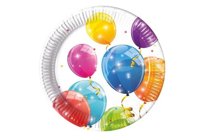 Sada osmi papírových talířků o průměru 23cm s veselým potiskem balónků.