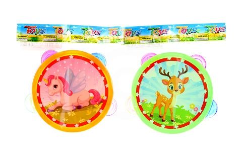 Veselá tamburína s motivem zvířátek o průměru 13,5 cm. Materiál plast. Baleno v sáčku. Rozměry balení 17,5x19x2,5 cm. Věk 3+