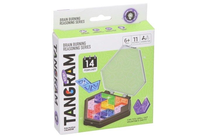 Tangram hlavolam. Velikost 10 cm. Obsahuje šablony na poskládání různých obrazců a konkrétních dat (den matek, Valentýn atd). Pokuste se sestavit dílky tak, aby šlo vidět pouze konkrétní datum a den v týdnu. 2 varianty - černá, bílá.