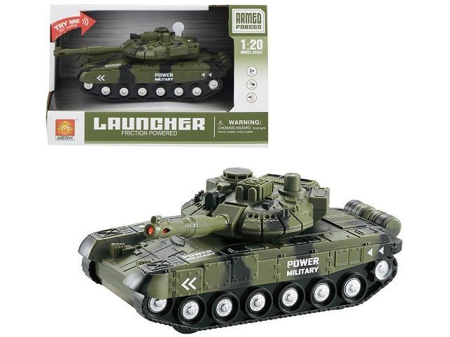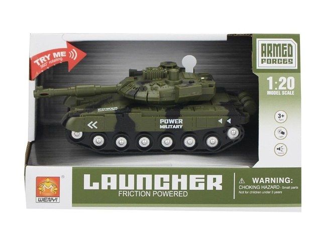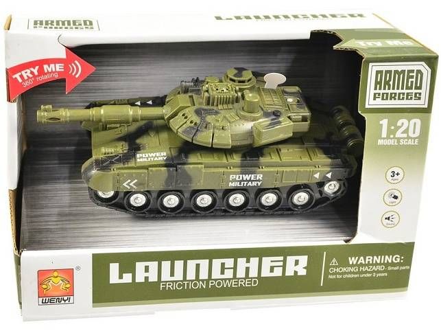 Tank na setrvačník, se světlem a zvukem, 19 cm. Hračka je určena pro děti 3+. Rozměr hračky je 19 x 7 x 7 cm. Materiál hračky je plast. Balení hračky je open box. Produkt je určený pro kluky. Ke zprovoznění produktu jsou potřeba 3 AG13 baterie. Baterie jsou součástí balení.
