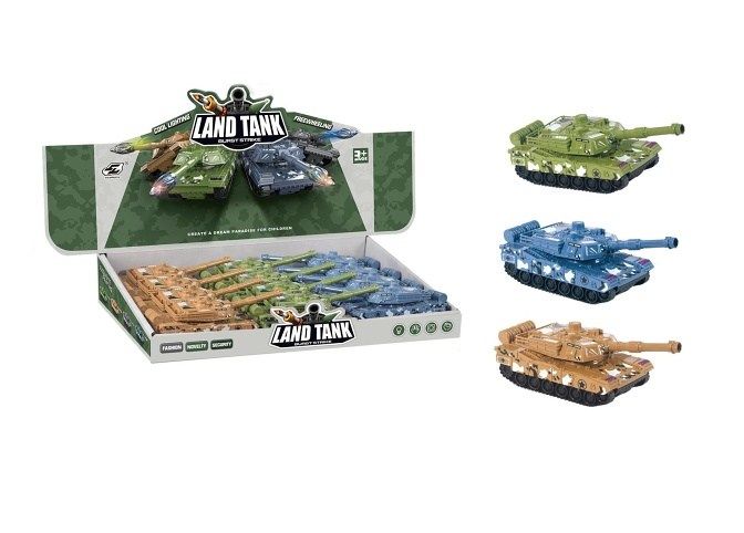 Tank. Rozměry 15x5x4,5 cm. Na setrvačník. 12 ks display box. 3 varianty - hnědý, zelený, modrý. Bez efektů, není na baterie.