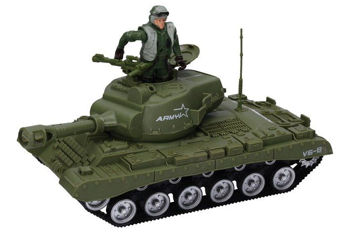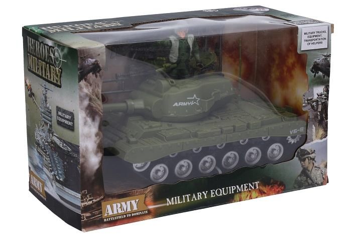 Tank s vojákem a doplňky. Velikost tanku 26 cm. Na setrvačník.