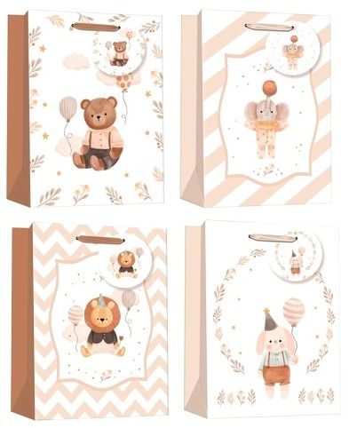 Dárková taška s motivem roztomilých zvířátek Přemýšlíte, jak rychle a pěkně zabalit dárek? Využijte k tomu některou z našich dárkových tašek! Dárkovou tašku využijete k různým příležitostem. Ideální taška na věnování dárku k narození miminka. Čtyři motivy, dodáváme v mixu.