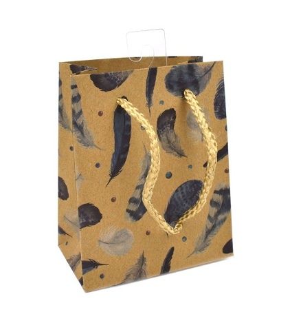 Taška dárková papírová kraft, pírka, 11 x 13,5 x 6 cm