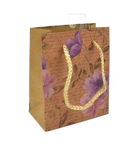 Taška dárková papírová kraft, písmo a kytky, 11 x 13,5 x 6 cm
