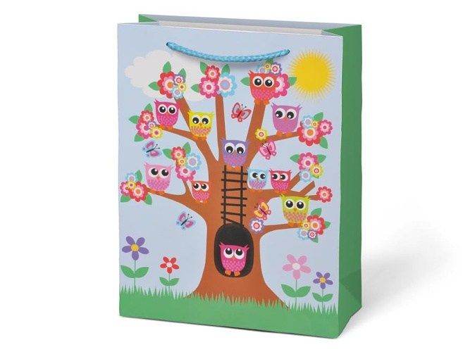 Papírová dárková taška s potiskem - sovy - Každý dárek musí být v něčem zabalený. Pokud nemáte čas balit ho do balicího papíru, máme pro Vás na výběr nejrůznější dárkové tašky. Motiv: sovy na stromě Taška má pevné ucho pro snadné přenášení a štítek pro vepsání jména či přání. Uvedená cena je za 1 ks.