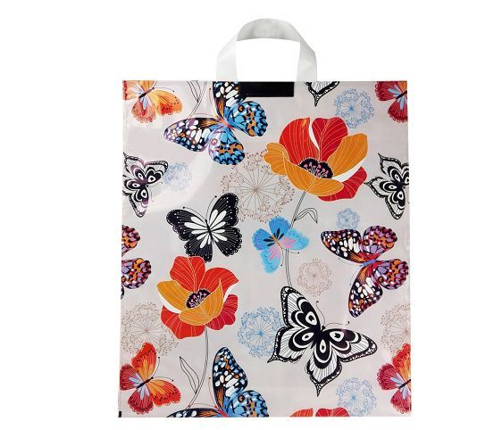 Neprůhledná igelitová taška s uchy je vyrobena z polyetylenu s potiskem motýlů, určená pro přímý styk s potravinami. Složené dno. Rozměr: 35 x 50cm