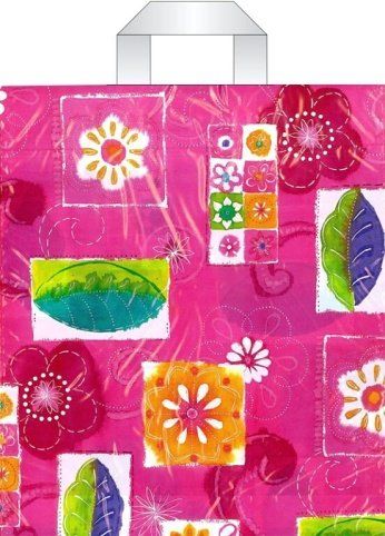 Neprůhledná igelitová taška s uchy je vyrobena z polyetylenu s potiskem květů, určená pro přímý styk s potravinami. Složené dno.
