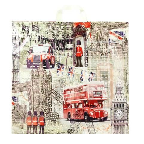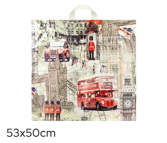 Neprůhledná igelitová taška - vyrobena z pevné igelitové folie z polyetylenu- navařené páskové ucho- potisk Londýna- rozměr: 53 x 50cm