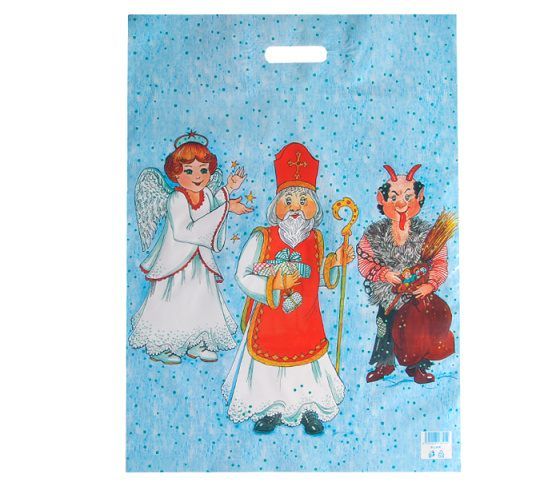Mikulášské tašky jsou vyrobeny z bílého polyetylenu jsou určeny pro přímý styk s potravinami. Provedení proseklé zpevněné ucho včetně složeného dna. Výborně se tak hodí k přípravě dárkového balení Mikulášských dobrot. Motiv je umístěn na přední straně tašky, zadní strana je naopak čistě bílá.Rozměry: 60 x 43,3cm