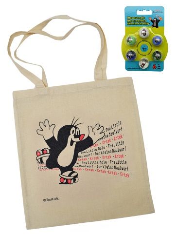 Plátěná přírodní taška přes rameno s potiskem Krtečka. Materiál 100% bavlna. Pratelná. Bonus: sada 6ks barevných skleněných kuliček s motivy Krtečka.