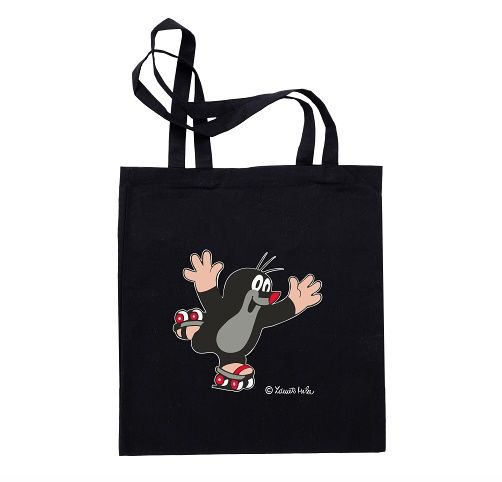 Plátěná taška v černé barvě s potiskem Krtečka. Dlouhá ucha umožňují nosit plátěnku přes rameno a usnadňují použití i malým dětem.