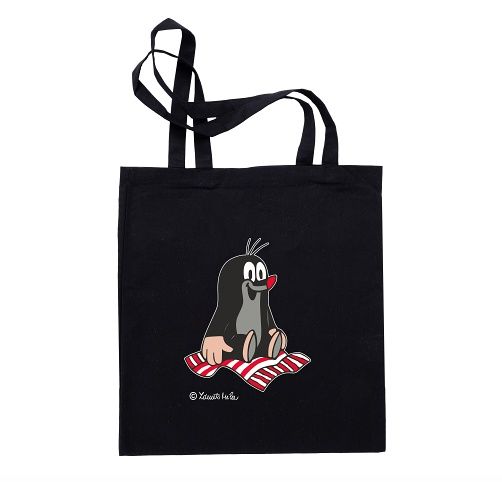 Plátěná taška v černé barvě s potiskem Krtečka. Dlouhá ucha umožňují nosit plátěnku přes rameno a usnadňují použití i malým dětem.