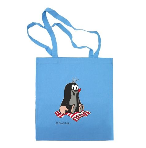 Plátěná taška v modré barvě s potiskem Krtečka. Dlouhá ucha umožňují nosit plátěnku přes rameno a usnadňují použití i malým dětem.