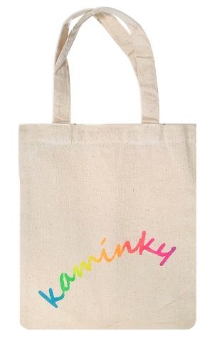 Látková taštička s barevným nápisem KAMÍNKY k přenášení malovaných kamínků i malířských potřeb.