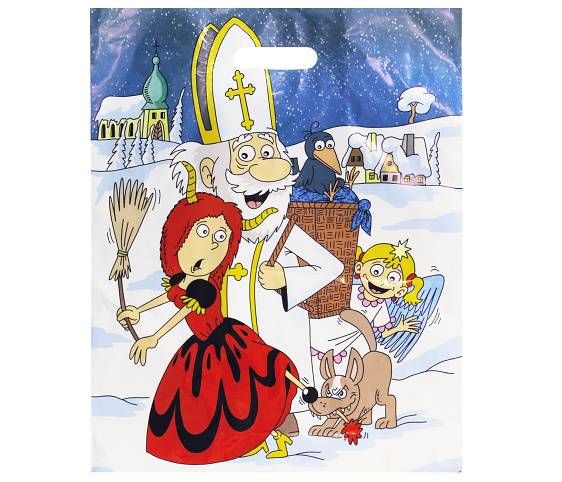 Mikulášské tašky jsou vyrobeny z bílého polyetylenu jsou určeny pro přímý styk s potravinami. Provedení proseklé zpevněné ucho včetně složeného dna. Výborně se tak hodí k přípravě dárkového balení Mikulášských dobrot. Motiv je umístěn na přední straně tašky, zadní strana je naopak čistě bílá.Rozměr: 46,3 x 35,5cm
