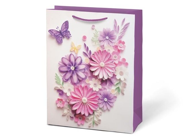Květinový motiv v odstínech růžové a fialové působí jemně a elegantně. Papírová taška L LUX zaujme plastickým efektem květin, který dodává balení hloubku a živost. Kombinace s motýly vytváří harmonický celek, který dokáže zvýraznit každý dar. Taška je vhodná pro různé příležitosti – narozeniny, svátky nebo poděkování. Povrch s decentním leskem doplňují pletené provázkové uši, které ladí s barvami motivu. Motiv: květiny, motýli Rozměry: 250 × 300 × 100 mm Uvedená cena je za 1 ks.