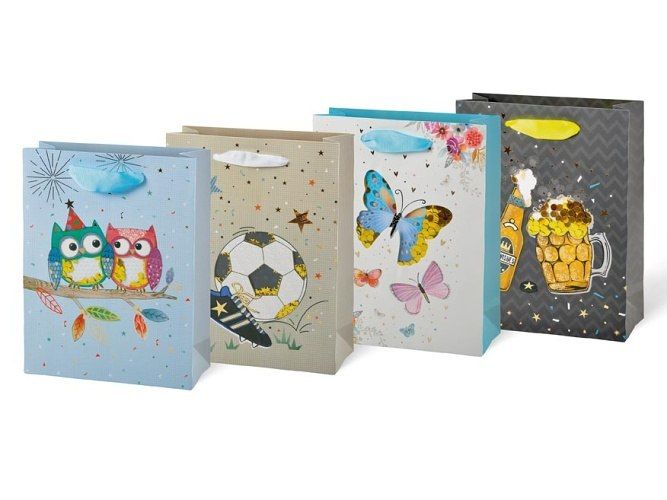 Dárková papírová taška s moderním designem. Dárkové tašky jsou skvělé na dárky, které lze jen těžko zabalit do balícího papíru. Velmi praktické jsou také pro ty, co dárky neradi balí nebo to moc neumí a nebyli by spokojeni se svým výsledkem. Motivy: - fotbal - sovy - pivo - motýly