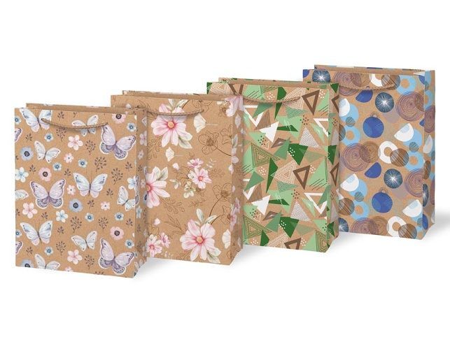 Když chcete potěšit už na první pohled! Elegantní a pevná dárková taška M KRAFT v sobě spojuje jednoduchost přírodního materiálu a jemný design. Na přírodním kraftovém papíře vynikají detailní motivy – romantické květiny, poletující motýlci nebo moderní geometrické vzory. Každý motiv má svou atmosféru, všechny ale působí vkusně a originálně. Taška je dostatečně prostorná a univerzální – hodí se na drobné dárky i větší překvapení. Ať už slavíte narozeniny, svátek nebo jen chcete potěšit, s touto taškou uděláte dojem ještě dřív, než se dárek rozbalí. Rozměr: 190 × 250 × 90 mm Motiv: motýli, květy, geometrické tvary Uvedená cena je za 1 ks.