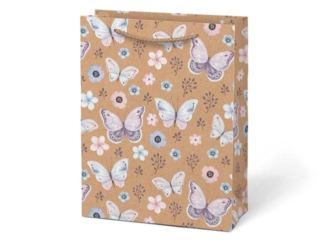 Když chcete potěšit už na první pohled! Elegantní a pevná dárková taška M KRAFT v sobě spojuje jednoduchost přírodního materiálu a jemný design. Na přírodním kraftovém papíře vynikají detailní motivy – romantické květiny, poletující motýlci nebo moderní geometrické vzory. Každý motiv má svou atmosféru, všechny ale působí vkusně a originálně. Taška je dostatečně prostorná a univerzální – hodí se na drobné dárky i větší překvapení. Ať už slavíte narozeniny, svátek nebo jen chcete potěšit, s touto taškou uděláte dojem ještě dřív, než se dárek rozbalí. Rozměr: 190 × 250 × 90 mm Motiv: motýli, květy, geometrické tvary Uvedená cena je za 1 ks.